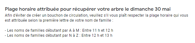 Pour ceux qui ont réservé un arbre ET un test d’eau, vous devrez récupérer ceux-ci le dimanche 30 mai selon l’horaire suivante :