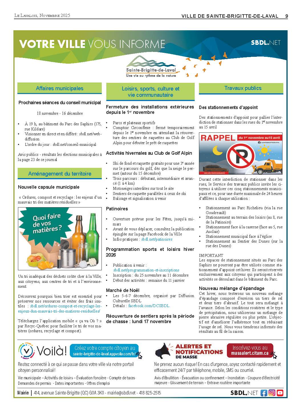 Comme à chaque parution, retrouvez les actualités municipales dans votre Journal Le Lavalois, un média local qui informe et rassemble les citoyens de Sainte-Brigitte-de-Laval. Afin de renforcer nos communications et de rejoindre un maximum de gens, la Ville y présente une page dédiée aux informations municipales.