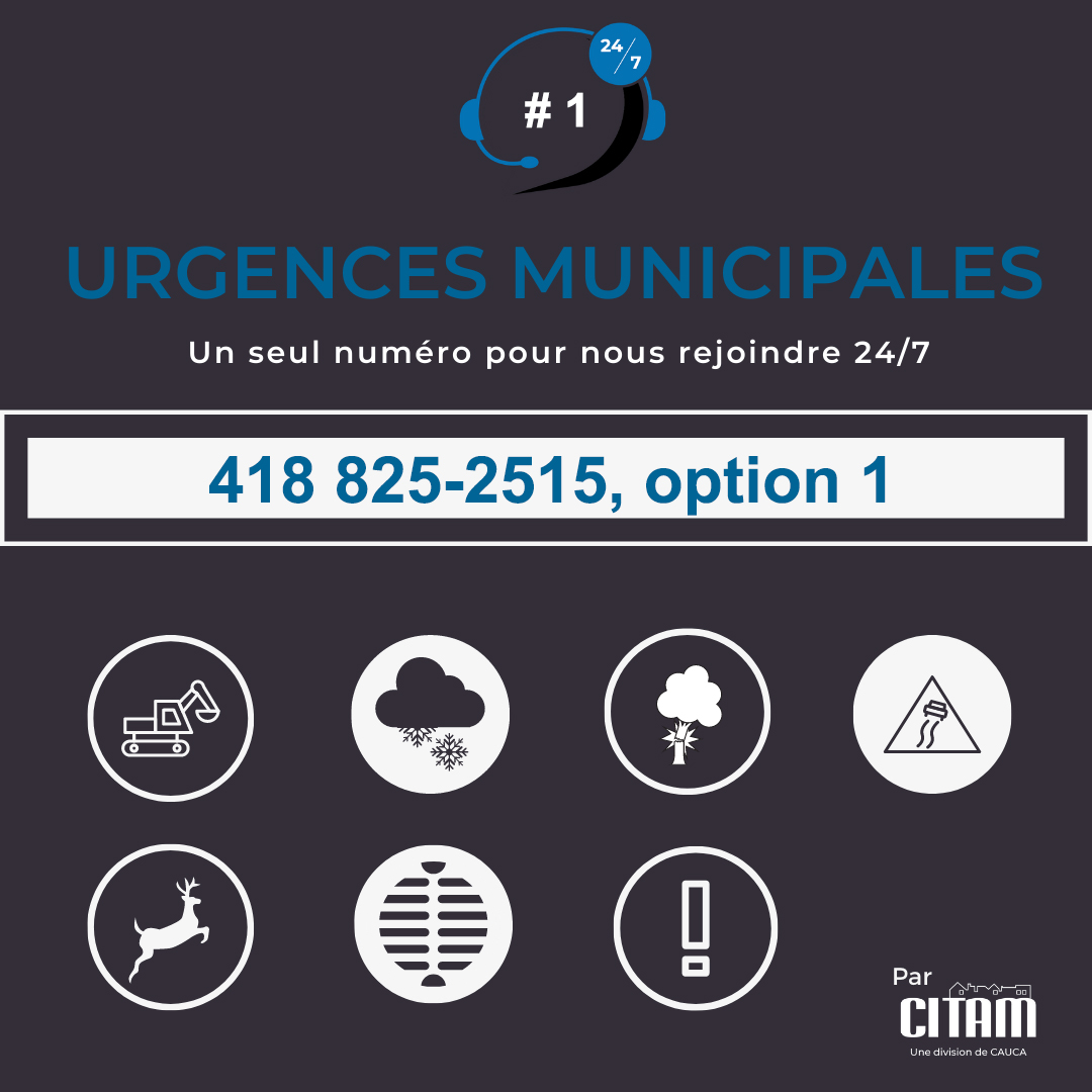 À compter d’aujourd’hui, les citoyens pourront dénoncer une situation municipale urgente en composant le 418-825-2515, SUIVI DU 1, et l’appel sera automatiquement redirigé vers la centrale CITAM. De cette façon, nous créons une porte d’entrée unique pour les citoyens et la prise en charge immédiate d’une situation qui nécessite une intervention rapide de la Ville.