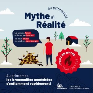 Alors que le printemps s’installe, la Ville de Sainte-Brigitte-de-Laval souhaite informer ses citoyens que l’indice de danger d’incendie de la Société de protection des forêts contre le feu (SOPFEU) se situe actuellement au niveau « Très Élevé ». Bien que le sol soit humide et que des restes de neige soient encore visibles sur le territoire, croire que le danger d’incendie est bas en ce moment constitue un mythe important qu’il faut dissiper.