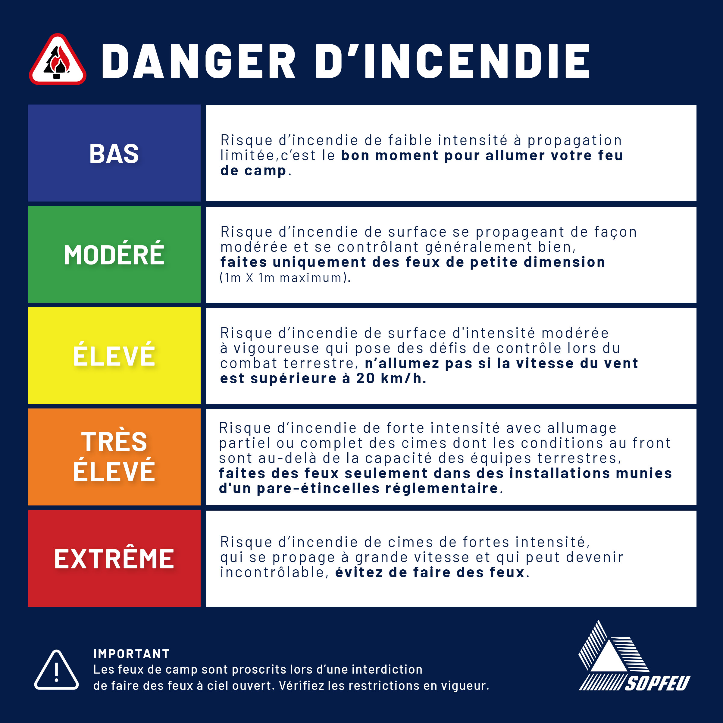 La sécurité de notre communauté est l’affaire de tous. Selon les directives de la SOPFEU et la réglementation municipale, lorsque le danger est « Très Élevé » :