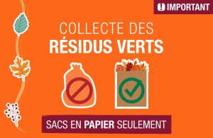 La collecte des résidus verts aura lieu le mercredi 5 novembre dans les secteurs nord et sud de Sainte-Brigitte-de-Laval. Elle se poursuivra au cours des jours suivants, au besoin, selon la quantité de sacs à collecter.