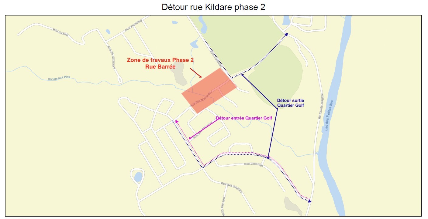 La Ville souhaite informer les résidents et les usagers du secteur que la portion de la rue Tremblay située entre la rue du Golf et la rivière aux Pins sera fermée à la circulation pour permettre la poursuite des travaux de la phase 2.